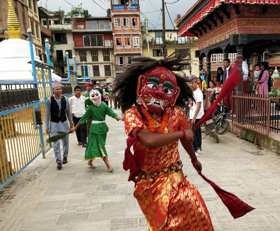 The next day, (August ..) Matya Festival is celebrated in Patan city. Men and women walk in line of thousands between the musician groups with various comedy shows, mask dancing in the street the whole day.